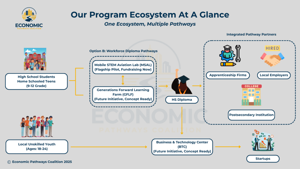 A high-tech mobile classroom offering aviation, drone, and AI learning experiences that align with Alabama’s Option B Workforce Diploma and Career Readiness Indicators.